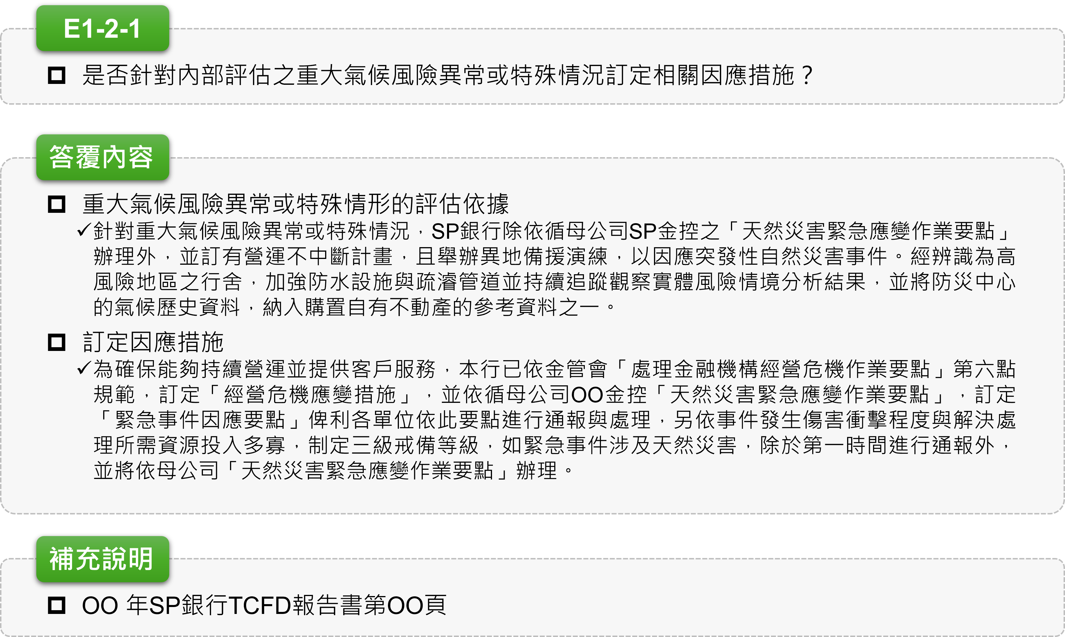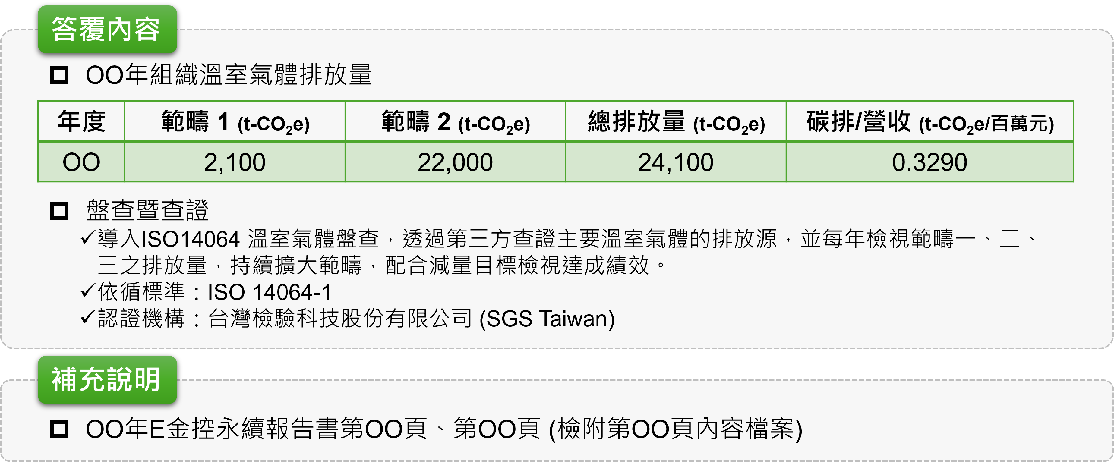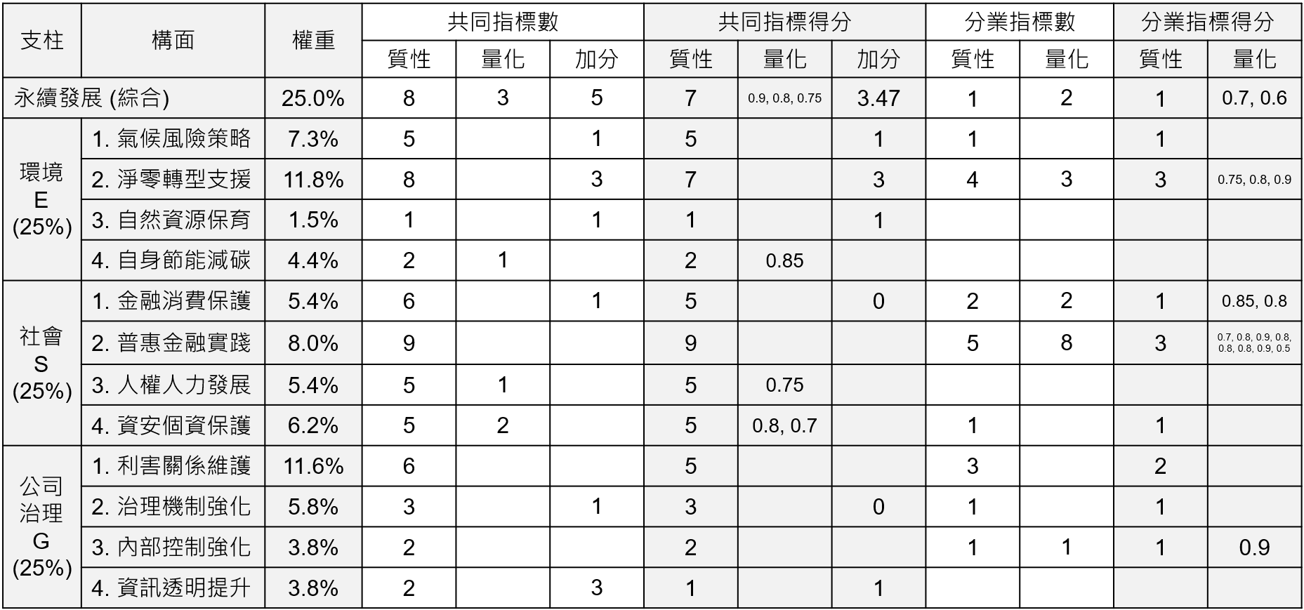 二、「支柱 (ESG) 指標」:三支柱項下各設有四個構面,各個構面依照項下共同題指標的數量(但不包含加分題)設定不同權重。